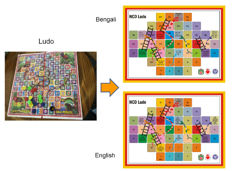 In Bangladesh, we recruited 13 young community women with at least secondary level education and conducted a one-day workshop in November 2016. We tried several health topics and educational tools, including a board game, demonstration of sugar and salt amount, etc., and found that a popular local board game could be modified as an educational tool (Figure 1). We developed a health education module composed of a lecture, Q & A about risky behaviour, NCD board game, and role plays.