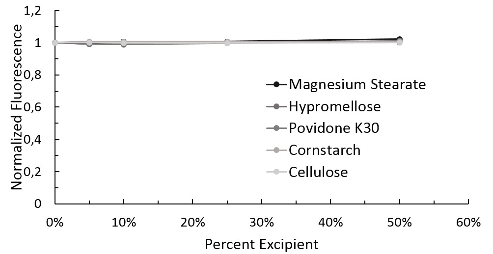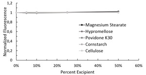 To this end, we conducted specificity testing with the most commonly published excipients found in cipro formulations.27,28 We tested the effects of added cellulose, hypromellose, cornstarch, povidone k30, and magnesium stearate, using the procedure outlined above. As shown in Figure 3, none of these excipients greatly affect the cipro fluorescent signal, even in the presence of up to 50% excipient.