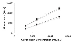 Cipro exhibits a linear fluorescence response in a range from 0.00125 mg/mL to 0.005mg/mL both before and after mixture with probe. This linear trend can be exploited to quantify samples with unknown amounts of cipro.