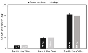 Enro, another fluoroquinolone similar in structure to cipro, is used extensively in veterinary medicine. We adapted our assay to quantify enro by changing the solvent for dissolving the tablet. Because enro is not water soluble, we instead used acetate buffer for dissolution. Then, following the assay procedure described above, we quantified 3 different dosage forms of veterinary enrofloxacin Brand D with an average error of 4.5% measured against package indication. 9 samples from each of the 15 mg and 50 mg tablets were quantified, while 6 samples from 150 mg tablets were quantified, shown in Figure 4. The 15 mg Brand D tablet quantified using the fluorescence assay as 15 mg, while the 50 mg and 150 mg tablets quantified at 49mg and 156 mg respectively.
