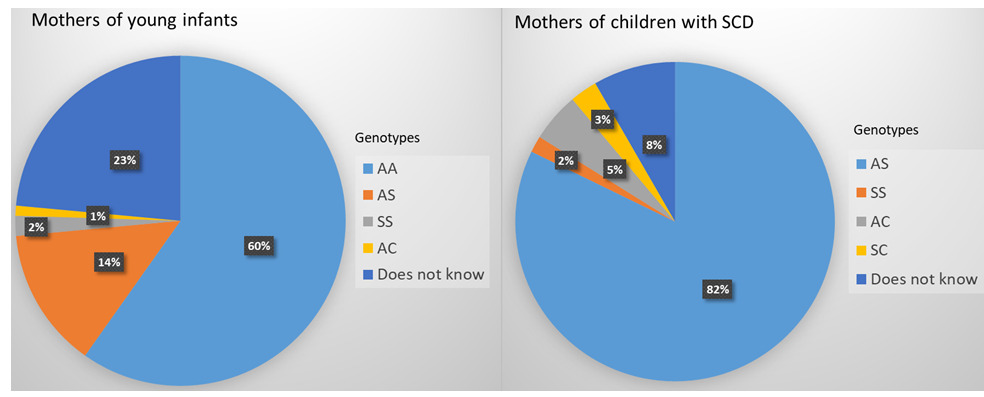 Almost all (91.2%) the mothers of affected children knew their own haemoglobin genotype and 90% knew that of their husband, while 76.1% of mothers of young infants knew theirs and 66.3% knew that of their husband (χ2=P<0.001). The full distribution of genotypes of the mothers is shown in Figure 1. More than half of the mothers of young infants attending primary health facilities did not know their genotype nor that of their husband. About 5% – SS (2%), SC (3%) – of the caregivers were patients themselves.