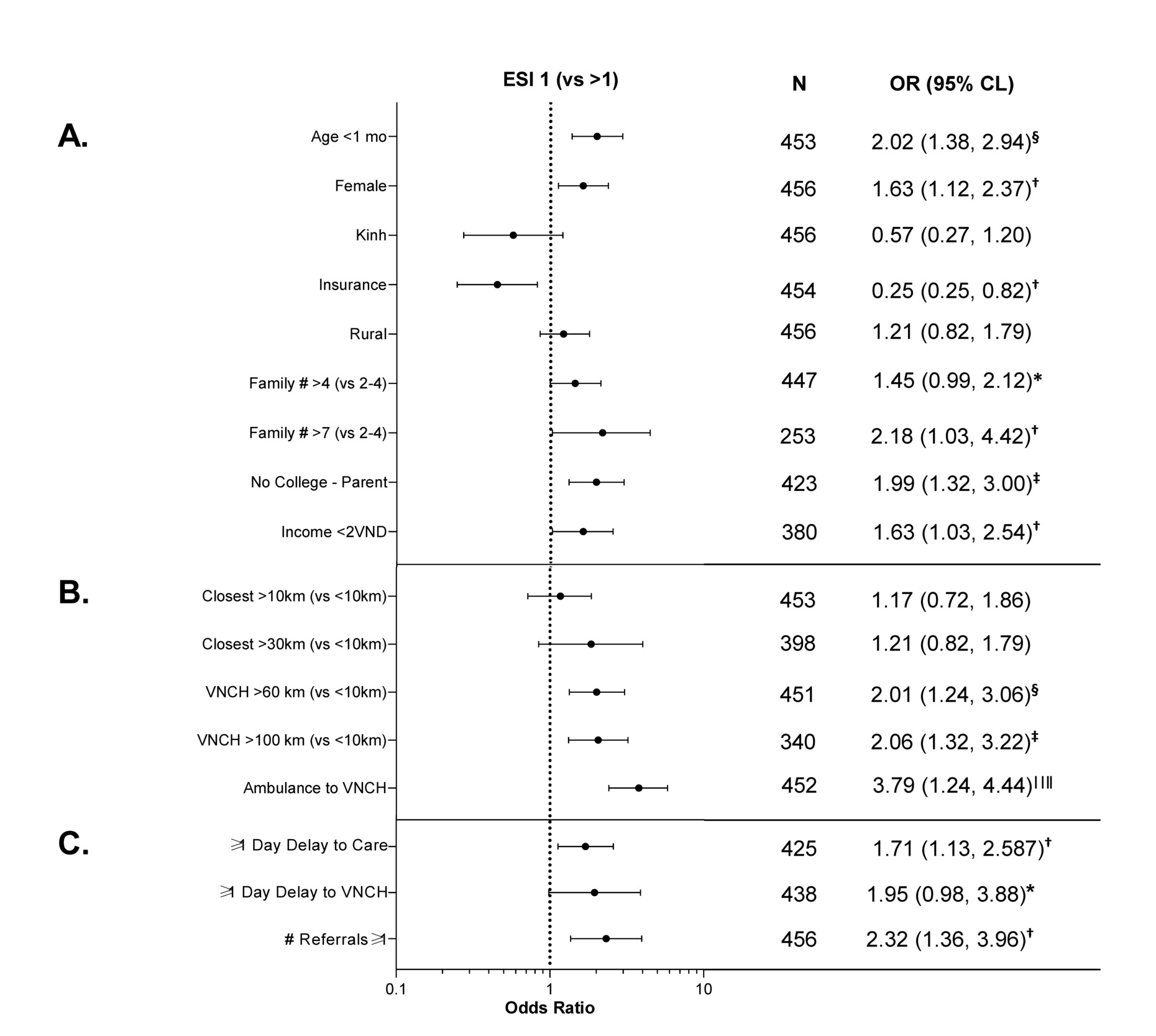 Multivariate analysis was performed to examine factors that increased the odds of an admission with the highest acuity ESI score of 1 (Figure 2). The following demographic variables were associated with an ESI=1: age under one month, female sex, family size >4 members or >7 members, parental lack of college education, and family income under 2 million VND per family member (Figure 2, Panel A). Importantly, insured patients were less likely to present with an ESI=1 on admission.