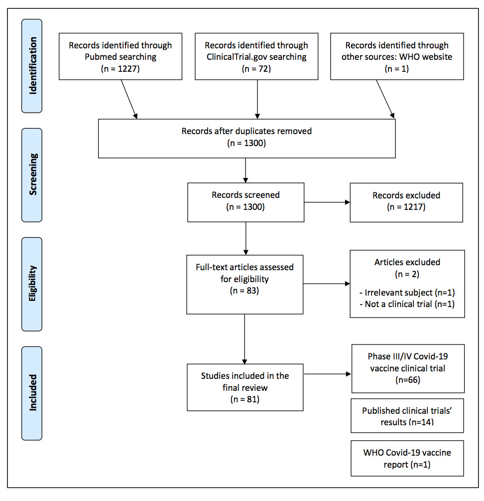 A review of the scientific literature was conducted with the aim to study the therapeutic trials of vaccines against the coronavirus disease 2019 (COVID-19). To this end, as of January 24, 2021 a search for articles published on PubMed using the Mesh word “COVID-19 Vaccine”, as well as a search for protocols registered on ClinicalTrials.gov by combining the words “COVID-19”, “SARS-CoV-2” and “Vaccine” was made. The published WHO reports on candidate COVID-19 vaccines were reviewed. At first, citations that were not in French or in English and not a clinical trial or randomized controlled trial were excluded. Then, those with irrelevant information or subject and studies with focus other than COVID-19 vaccine development or clinical trial were excluded. For registered protocols, those in relation with drugs were excluded.