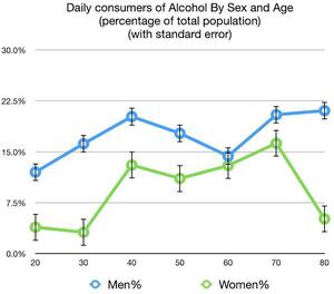41.8% of all individuals surveyed reported currently drinking alcohol (men, 54.7%; women, 33.3%). Of individuals who reported drinking alcohol, 6.5% of men and 3.6% of women reported that alcohol had been a problem in their life. 28 individuals reported that their alcohol use was still a problem, and 16 individuals reported having been hospitalized for alcohol-related problems. 50.0% of all individuals who reported drinking alcohol consumed it on a daily basis, with 26.7% consuming several servings per day. Analyzing alcohol use by age and sex found that 17.6% of men aged 18 to 45 consume alcohol on a daily basis, compared to only 8.1% of women in the same age group (Figure 6).