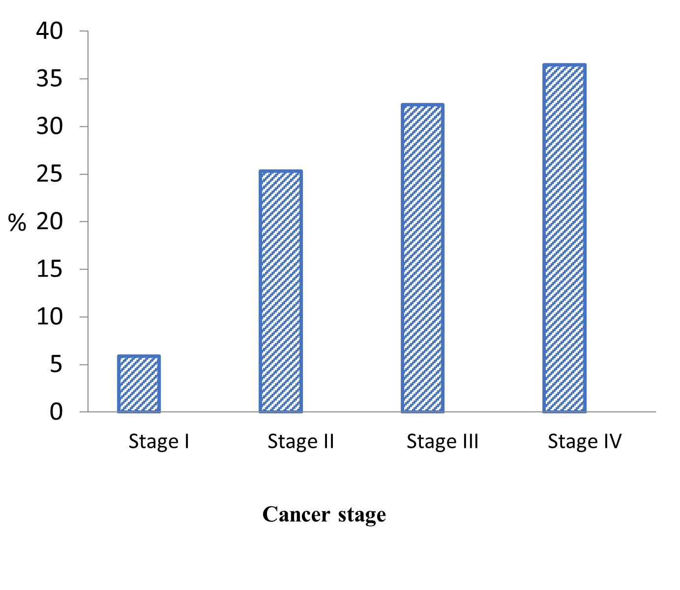 All types of childhood malignancies were eligible for treatment at the unit, with the exception of brain tumors. Leukemias represented the largest percentage of cancers presented at the unit (45.0%), followed by blastomas (23.6%), and lymphomas (18.8%). The most prevalent diagnosis was acute lymphoblastic leukemia (30.6%), followed by Non-Hodgkin’s Lymphoma (13.0%), and neuroblastoma (9.8%). Overall, the median number of days for diagnostic delay was 55, ranging from 3 to 1,093 days, nearly 3 years (Table 2). This diagnostic delay resulted in a large majority of patients (68.8%) with solid tumors presenting at Stage III (32.3%) or Stage IV (36.5%) cancer (Figure 1).