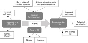 Interview data on pneumoconiosis patients’ experience in CBPR was concentrated into 26 sub-categories, nine categories, and four themes: triggering of a difficult life, reconstruction of life, sense of empowerment, and gaps in PR. Themes, categories, and subcategories are elaborated in Table 2. A schematic representation of the situation is shown in Figure 1.